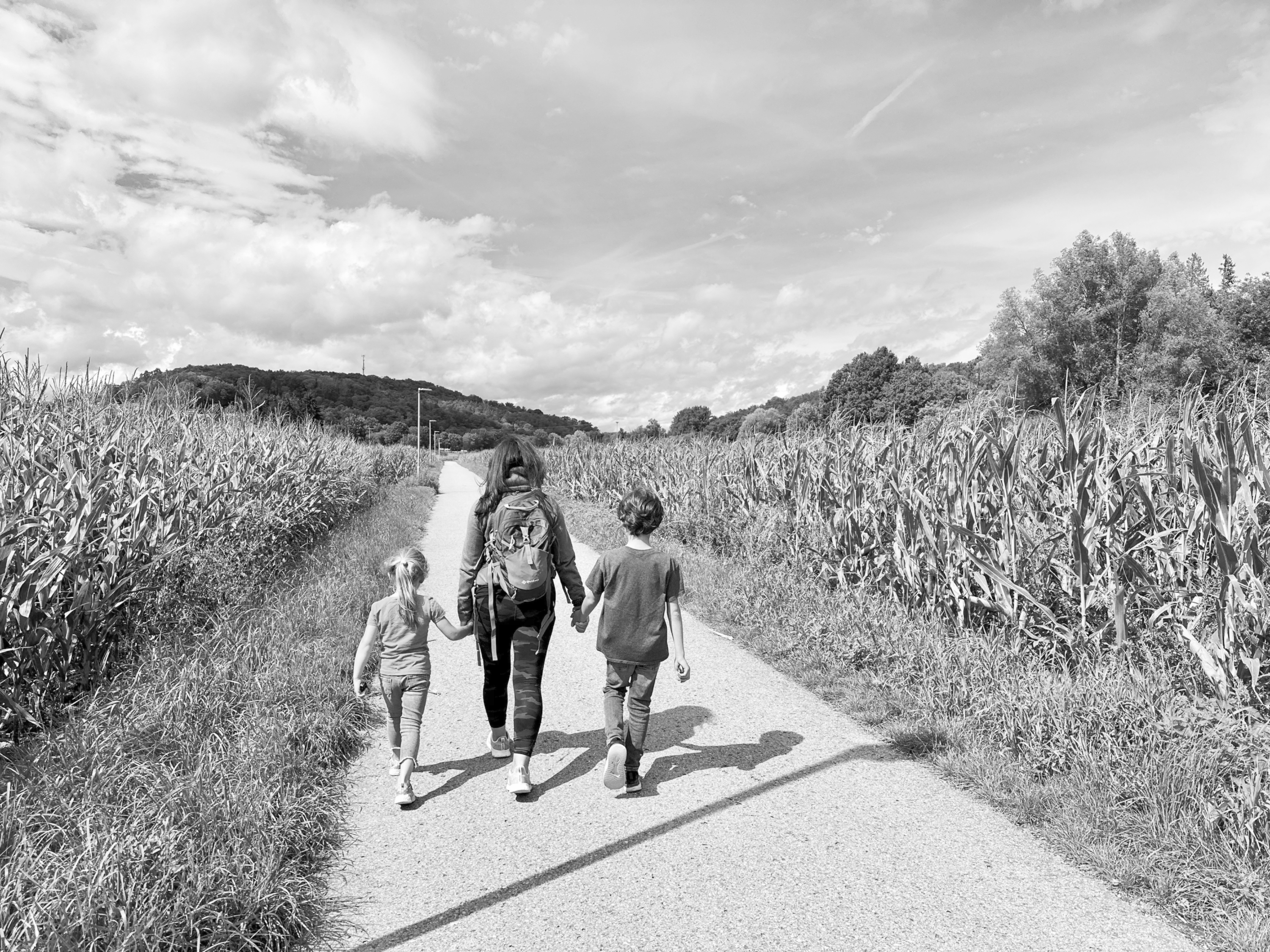 A mom holding hands with her children, walking through fields.